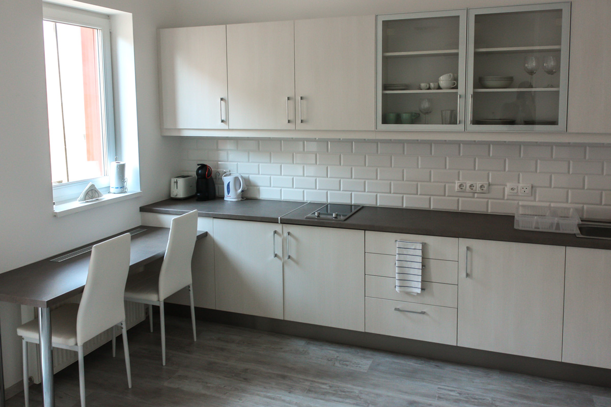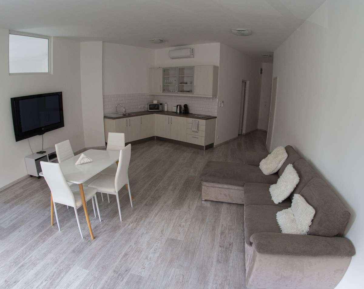 Les appartements lumineux sont équipés dans un style modern et disposent d’un intérieur spacieux, une cuisine entièrement équipée, un salon, une chambre à coucher et une salle de bains.